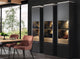 Finished in lacquered anthracite matt, the cabinet is complemented by slatted oak front accents that introduce natural texture and visual warmth. Clear OptiWhite glass doors maintain a crisp, refined appearance, while premium fittings with soft-close mechanisms ensure smooth and quiet operation. Adjustable feet, accessible from inside the unit, allow for precise positioning on uneven floors.